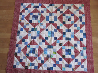 I have just this minute finished my big Pineapple Blossom quilt. It is 110 inches square, which makes it generous king-size. I have been working on this off and on for a couple of months now. I made a throw-sized Pineapple Blossom for a class at work and then just kept on making blocks until I came up with the king. I put a different border on this one. I used the bonus half-square triangles from the blocks to go all around the quilt as the second border. The first and third borders were a tone-on-tone black to frame all the different fabrics in the blocks. It's funny but I make all these quilts out of my scrap bins but the bins never seem like there is anything missing. This one won't get quilted probably until next month because my favorite long-arm quilter, Vonda Cochran, is going away on vacation. That's ok, this can wait until she gets back. I don't have any definite plans for it anyway.